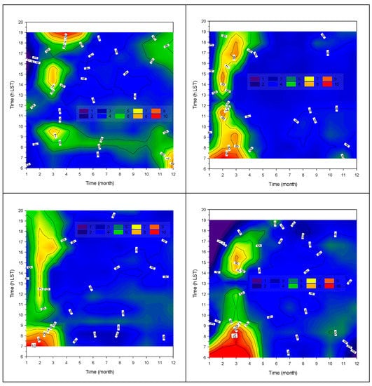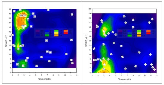 Kambezidis et al. [71] first introduced the methodology for the month–hour distribution of a meteorological parameter through its application to daylight levels in Athens. Those researchers listed the advantages of using such an analysis. This methodology is also followed in the present study. Due to the large number of sites considered in this work, it is not possible to show diagrams for all 33 locations; therefore, a pair of representative sites per climatic zone has been chosen (as in Figure 2); these are Irakleio and Kalamata for zone A, Agrinio and Lesvos for zone B, Alexandroupoli and Tripoli for zone C, and Kastoria and Serres for zone D.