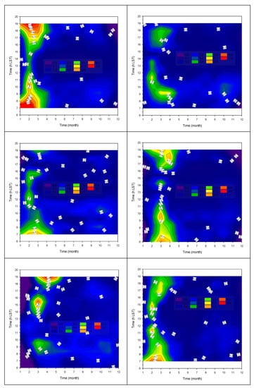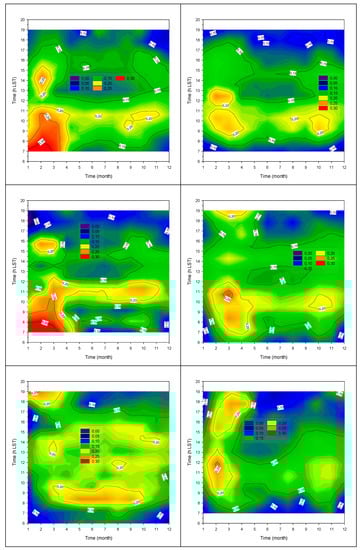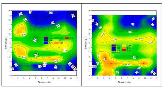 Month-hour diagrams of the TUM values in TATY under clear-sky conditions in climatic zone A: first raw, Irakleio (left), Kalamata (right); climatic zone B: second raw, Agrinio (left), Lesvos (right); climatic zone C: third raw, Alexandroupoli (left), Tripoli (right); climatic zone D: fourth raw: Kastoria (left), Serres (right). The color code refers to the TUM levels, which have been kept in the range 0 < TUM ≤ 0.3. The 06.00–20.00 h LST interval limitation of the graphs is due to the adopted criterion γ ≥ 5°.
