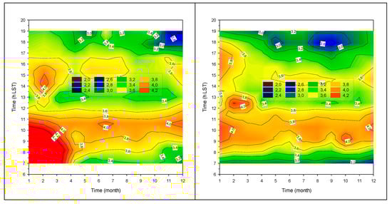 Month–hour diagrams of the TL values in TATY under clear-sky conditions in climatic zone A: first raw, Irakleio (left), Kalamata (right); climatic zone B: second raw, Agrinio (left), Lesvos (right); climatic zone C: third raw, Alexandroupoli (left), Tripoli (right); climatic zone D: fourth raw: Kastoria (left), Serres (right). The color code refers to the TL levels, which have been kept in the range 2 ≤ TL ≤ 4.2. The 06.00–20.00 h LST interval limitation of the graphs is due to the adopted criterion γ ≥ 5°.