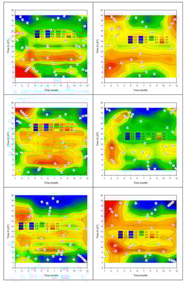 Month–hour diagrams of the TUM values in TATY under all-sky conditions in climatic zone A: first raw, Irakleio (left), Kalamata (right); climatic zone B: second raw, Agrinio (left), Lesvos (right); climatic zone C: third raw, Alexandroupoli (left), Tripoli (right); climatic zone D: fourth raw: Kastoria (left), Serres (right). The color code refers to the TUM levels, which have been kept in the range 0 < TUM ≤ 1. The 06.00–20.00 h LST interval limitation in the graphs is due to the adopted criterion γ ≥ 5°.
