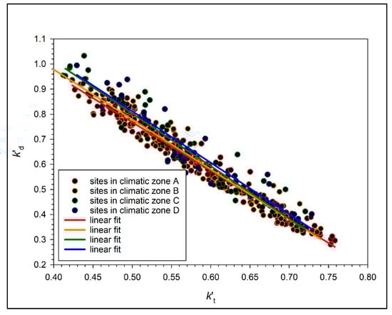 Monthly mean k’d vs. k’t data pairs for sites belonging to the same climatic zone under all-sky conditions in TATY and their best-fit lines. Linear regression equations for (i) climatic zone A: k’d = 1.730−1.925 k’t, R2 = 0.97; (ii) climatic zone B: k’d = 1.774−1.989 k’t, R2 = 0.96; (iii) climatic zone C: k’d = 1.851−2.097 k’t, R2 = 0.92; (iv) climatic zone D: k’d = 1.839−2.054 k’t, R2 = 0.90. The lower R2 values in the climatic zones C and D—and especially in D—are expected because of the fewer data points and harsher weather conditions at these sites in comparison to those in the other two climatic regions.