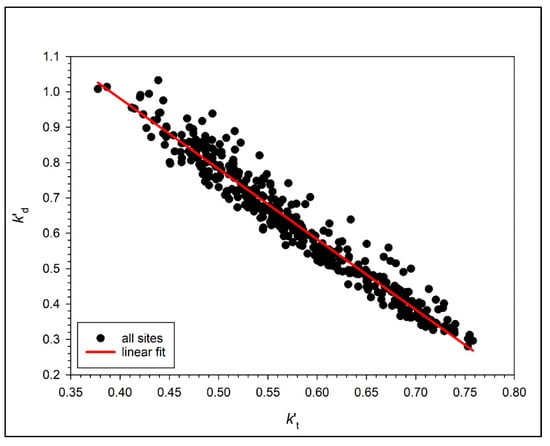 Monthly mean k’d vs. k’t data pairs for all 33 sites belonging to the four climatic zones under all-sky conditions in TATY and their best-fit line. Linear regression equation: k’d = 1.777−1.9991 k’t, R2 = 0.94.