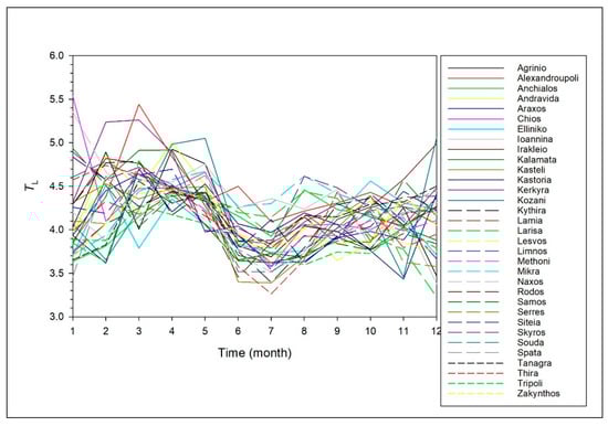 The observations drawn from Figure 4 may have another explanation. According to the definition of the Linke turbidity factor, during the late autumn–winter period, more clean–dry atmospheres are required to produce the observed attenuation of solar radiation because of extended cloudiness and higher humidity in the atmosphere in relation to those in the spring–early autumn period. Another observation from Figure 4 is that the winter TL values become lower around noon. This occurs for two further reasons: (i) TL is inversely proportional to the air mass (or solar elevation angle; see Equation (2)), and it therefore decreases at higher m’ values, and (ii) cloudiness and/or ambient humidity are reduced at midday. Similar patterns have been found at the other 25 sites (not shown here).