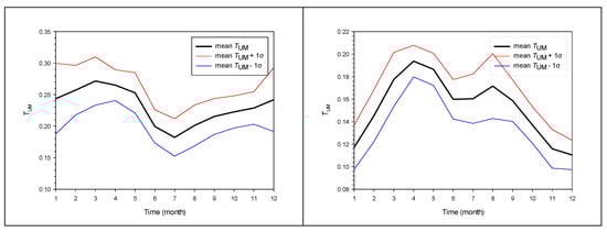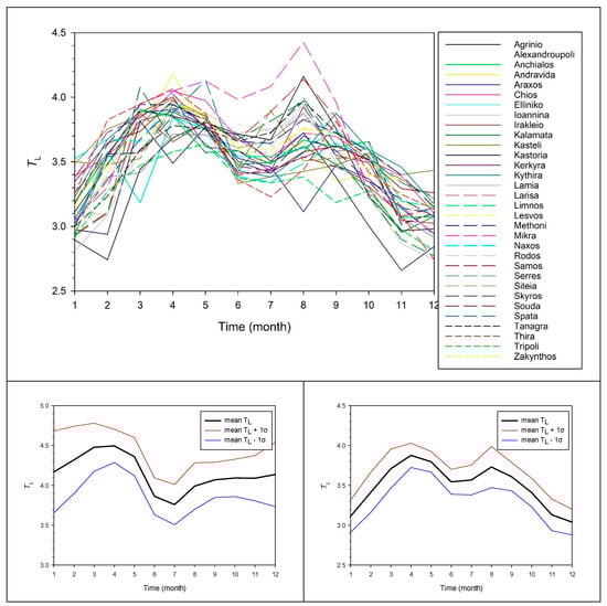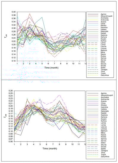 It is seen from Figure 10 that TL obtains a peak in March–April and shows a rather flat behavior after September for all-sky conditions (lower left graph). The black curve is the average of all 33 TL variations. Similar behavior is shown by the intra-annual variation of TL under clear skies. There are two pronounced peaks in April and August (lower right graph). Very similar intra-annual patterns and magnitudes of TL were reported by Pedrόs et al. [72] for Valencia, Spain; by El-Wakil et al. [73] for Cairo, Egypt; by Diabate et al. [14] for several sites in Africa; and by Eftimie [74] (2009) for Braşov, Romania. The spring and autumn peaks may be due to the frequent wind streams from Northern Africa, which may bring desert dust over Greece. The Sahara-dust transport has been a rather frequent phenomenon in the recent 20 years [75]. On the other hand, the summer minimum may be attributed to the strong cleansing northeasterly winds (called Etesians), which make the atmosphere drier. Figure 11 is same as Figure 10, but it refers to TUM. The peaks and the low summer values here have a similar interpretation to that given for TL.