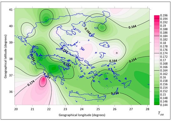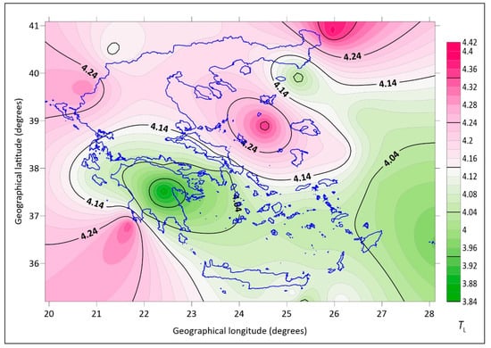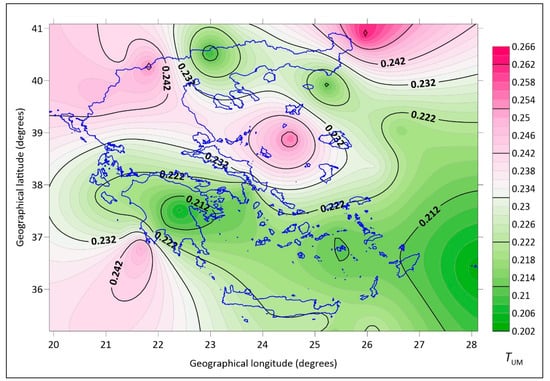 Figure 12 and Figure 13 present the distribution of the annual mean values of TL and TUM over the Greek territory, respectively, for all and clear-sky conditions. Two major peaks are seen in both TL and TUM values for all skies; one is centered over the South Ionian Sea and the other over the Central Aegean Sea. Both peaks are located in a northeast–southwest direction, and it is believed they are due to Sahara-dust transport mostly over Southern Greece in spring, late summer, and early autumn (first peak) and the turbulent air during high northeasterly winds over the Aegean Sea almost all-year round (second peak). During clear-sky conditions, the second peak is drastically reduced because it is related to the Etesian winds that blow during summertime and are associated with minimum humidity in the atmosphere.