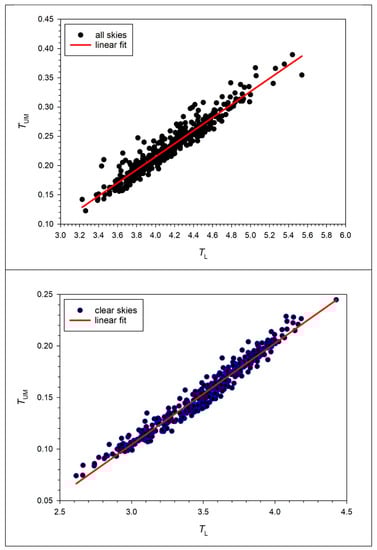 There are few studies worldwide that deal with the Unsworth–Monteith turbidity coefficient because of its dependence on the water-vapor content in the atmosphere, as stated in Section 3.1. However, those that exist show a straightforward linear dependence of TUM on TL and vice versa. Figure 14 shows this dependence for all and clear-sky conditions over Greece.