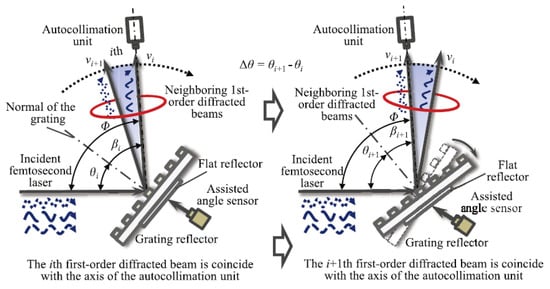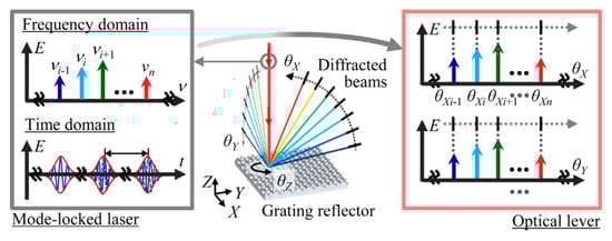 The equally-spaced optical modes in a mode-locked femtosecond laser, often referred to as an optical frequency comb, can be employed to generate an “angle scale comb” that can be employed as optical graduations for angle measurement. A schematic of the principle of generating an angle scale comb from a mode-locked femtosecond laser is shown in Figure 1. The angle scale comb is generated with the enhancement of the dispersive characteristics of a diffraction grating. A mode-locked femtosecond laser from a light source is constructed incident to a reflective-type diffraction grating. The ultra-short pulse train of a mode-locked femtosecond laser in the time domain is a series of equally-spaced optical modes with a pulse repetition rate νrep in the frequency domain. A reflective-type diffraction grating generates a series of first-order diffracted beams, in which each optical mode has a different angle of diffraction from those of the others. In the case where a two-dimensional reflective-type diffraction grating is employed as shown in the figure, groups of first-order diffracted beams will be generated in the two directions. It should be noted that only the groups of the positive first-order diffracted beams in the X- and Y-directions are indicated in the figure for the sake of simplicity. The angle of diffraction of the ith optical mode θi in the group of the positive first-order diffracted beams can be expressed as follows [54]: