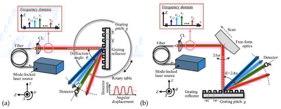 Since θ0 is known as the design parameter in the optical setup, Δθ can be obtained based on Equation (6) by calculating fj and fk based on the lens equation by using the detected peak frequencies νj and νk of the jth and kth modes, respectively. It should be noted that the setup shown in Figure 11 is similar to that shown in Figure 7 based on the dispersive characteristics of a grating reflector. One of the advantages of the optical setup shown in Figure 11 is that a reflective-type grating reflector is not required for measurement; this contributes to building up the optical setup to a compact size. In addition, an arbitrary reflective surface on an object can be measured by the setup shown in Figure 11. It should also be noted that the angle sensor with the diffraction grating shown in Figure 7 can be employed for the evaluation of an object with a reflective surface without grating pattern structures by modifying the optical setup as shown in Figure 2b. However, in this case, attention should be paid to misalignments of the optical components, as well as the alignment of an object under inspection.
