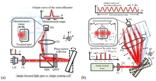 A comparison between the conventional laser autocollimator and the femtosecond laser autocollimator [55]: (a) A laser autocollimator with a single-mode laser source; (b) A femtosecond laser autocollimator with a mode-locked femtosecond laser source.