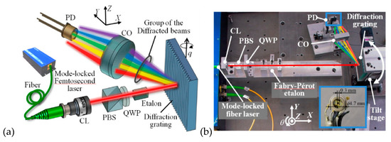 Optical setup of the mode-locked femtosecond laser autocollimator [55]: (a) A schematic of the optical setup; (b) A photograph of the optical setup.