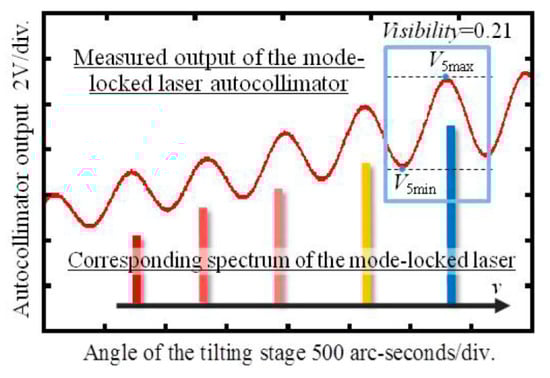 Most of the commercial fiber-based mode-locked femtosecond lasers have a pulse repetition rate on the order of 100 MHz. When such a laser source is employed in the light intensity detecting-type femtosecond laser autocollimator, the distance between the neighboring spots in the focal plane of the collimator objective reaches the order of several nanometers, and the spots cannot be distinguished separately. The pulse repetition rate is thus required to be extended by a Fabry–Pérot etalon in the femtosecond laser autocollimator described in Section 2.1.2. Due to the diffraction limit, it is unavoidable for the neighboring spots in the focal plane of the collimator objective to overlap with each other in most of the cases. This results in the degradation of the signal quality (visibility) of the reading output of the light intensity detecting-type femtosecond laser autocollimator. As can be seen in the result shown in Figure 5, maximum visibility that can be achieved by the femtosecond laser is approximately 0.5; this prevents the light intensity detecting-type femtosecond laser autocollimator to achieve further higher sensitivity.