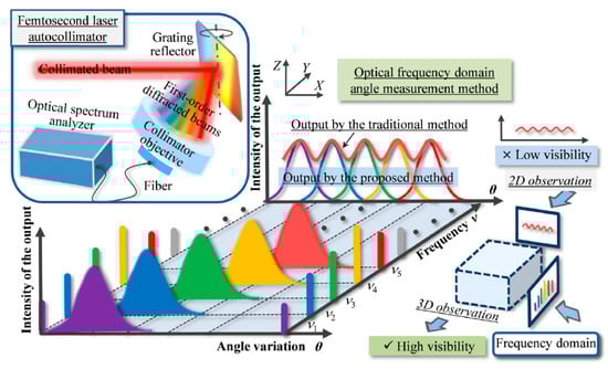 Figure 8 shows an example of the angle scale comb observed in optical frequency domain. As can be seen in the figure, each of the comb modes is successfully identified in the optical frequency domain. Although a limited result over an angle range of approximately 400 arc-seconds is indicated in the figure, each of the comb modes is verified to be identified over an angular range of approximately 6°, which is limited by the spectral width of the mode-locked femtosecond laser, as well as the resolving power of the diffraction grating employed in the setup. The expansion of the spectral range of a mode-locked femtosecond laser with a supercontinuum [71] is expected to achieve a further wider measurement range. In addition, the results have demonstrated that a high resolution of 0.03 arc-seconds can be achieved by interpolating the intensity variation of each of the comb modes.