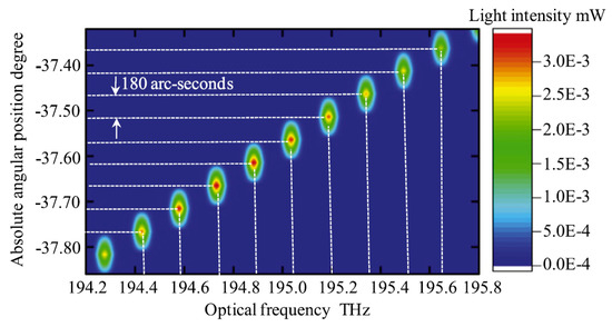 Figure 10 shows one of the examples of the absolute angle measurement based on the proposed method. As can be seen in the figure, the absolute angular position of the grating reflector in a step of 180 arc-seconds was well distinguished over the absolute angle range from −37.805 degrees to −37.354 degrees in the frequency domain; this means that the optical frequency comb can be directly converted into the angle scale comb for absolute angular position measurement.
