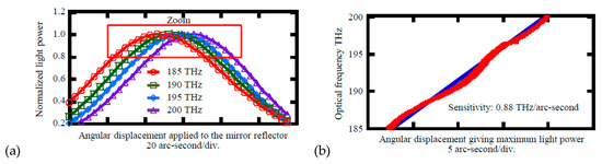 Figure 12a shows the change in the light intensity of each mode captured by the fiber detector analyzed in optical frequency domain. In the figure, only several modes from 185 THz to 200 THz in a frequency difference of 5 THz are plotted for the sake of clarity. As can be seen in the figure, the light intensity of each mode has been changed by the angular displacement of the mirror reflector. Figure 12b shows the peak frequencies observed at each angular position of the mirror reflector. By detecting the peak frequency in the spectrum of the light rays captured by the fiber detector, the angular displacement of the mirror reflector can thus be detected.