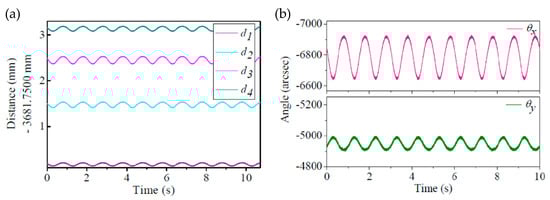 Figure 14 shows the detected angular motion of an object placed 3.7 m away from the DOE. In the experiment, angular motion with a frequency of 1 Hz was given to the object by using a piezoelectric tilt stage. Figure 14a shows the absolute displacements measured at the four positions, and Figure 14b shows the angular motions about the X- and Y-axes calculated from the obtained absolute displacements. As can be seen in the figures, the absolute distances at the four positions were successfully detected simultaneously, and the angular motions about the X- and Y-axes were successfully reconstructed from the obtained absolute distances.