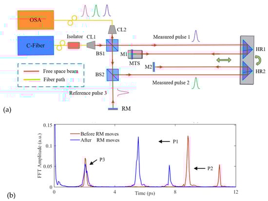 Figure 15a shows another example of applying the displacement measurement based on the mode-locked femtosecond laser [62]. The setup is based on a Michaelson interferometer designed to have a single reference arm and two measurement arms by splitting the collimated mode-locked femtosecond laser beam into three beams with beam splitters (BS1 and BS2). Through the demodulation of the interference spectrum of the three beams from the reference arm and the measurement arms based on a Fourier transform method [78], optical path differences among the three beams can be obtained simultaneously, as shown in Figure 15b.