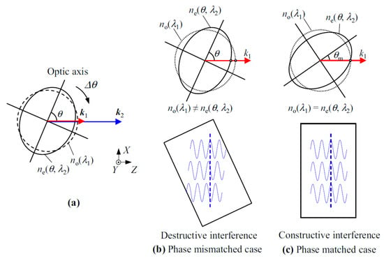 The matching angle in the second harmonic generation (SHG) [59]: (a) Refractive index ellipse of a negative uniaxial crystal; (b) Phase mismatched case; (c) Phase matched case.