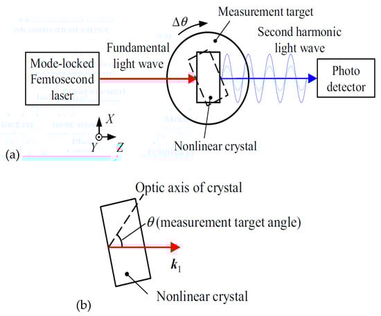 Measurement of the angular displacement of an object based on the characteristics of the matching angle in the second harmonic generation (SHG) [59]: (a) Schematic of the optical setup; (b) The angle to be measured by the method.