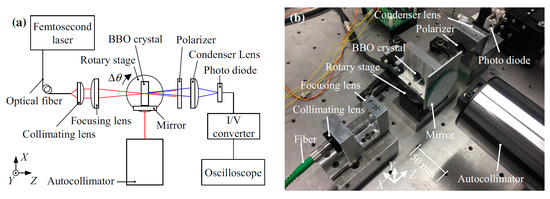 The feasibility of the method described above has been verified in experiments. Figure 18a,b show a schematic and a photograph of the developed setup. An Erbium-doped fiber-based mode-locked femtosecond laser with the spectrum ranging from 1480 nm to 1640 nm has been employed as the light source. The laser beam introduced into the setup is at first collimated by a collimating lens and is then made incident to a nonlinear crystal mounted on a rotary table. As can be seen in Equation (8), the intensity of the second harmonic light to be generated in a nonlinear crystal depends on the crystal material, as well as the light wavelength. In the setup, barium borate (BBO) crystal with a similar matching angle for each mode in the femtosecond laser has thus been employed as the nonlinear crystal. The optic axis of the nonlinear crystal is adjusted to be approximately 20 degrees. It should be noted that, regarding Equation (7), the fundamental light is made to focus in the BBO crystal so that the second harmonic light can be generated effectively. The second harmonic light generated by SHG is then condensed onto a photodiode by a condenser lens, and the photocurrent from the photodiode is converted into voltage signal through a trans-impedance amplifier to monitor the signal by an oscilloscope. It should be noted that not only the second harmonic light but also the remaining fundamental light would come out from the BBO crystal. In the setup, a polarizer is placed in front of the photodiode so that the fundamental light will not be detected. For the verification of the angular displacement of the BBO crystal, a commercial laser autocollimator is also employed as a reference sensor.