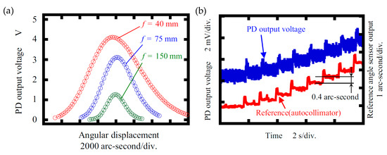 Figure 3a shows an example of the optical setup of a conventional laser autocollimator, which is based on the laser autocollimation [25]. A single-mode laser emitted from a laser source such as a laser diode (LD) is collimated by a collimating lens (CL) and is then made incident to a plane mirror reflector through a polarizing beam splitter (PBS) and a quarter-wave plate (QWP). The reflected beam from the plane mirror reflector goes through the QWP again, is reflected by the PBS, and is then captured by an autocollimation unit composed of a collimator objective (CO) and a photodiode (PD). In the autocollimation unit, the active cell of the PD is placed at the back focal plane of the CO so that the laser beam made incident to the CO can be focused on the PD active cell. The displacement Δd of the focused laser beam on the PD active cell due to the angular displacement Δθ of the plane mirror reflector can be expressed by the following Equation [4]: