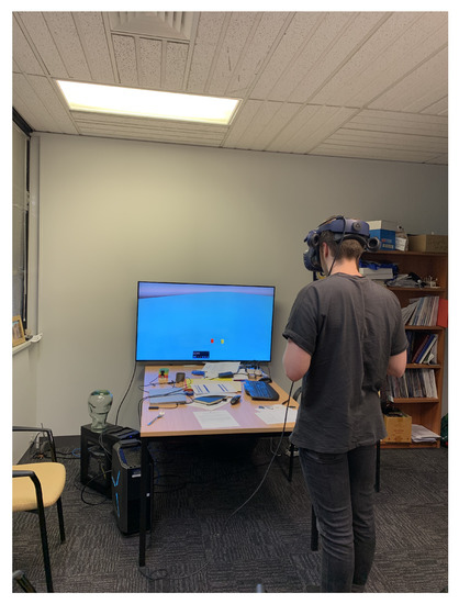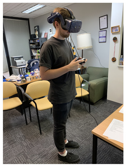 The experiment was conducted in a quiet office with only the participant and experimenter present during the study, and the total time of the experiment was less than one hour. Once the tasks started, the participants were asked to stand during the experiment. A Unity 3D application (version 2018.4.14f1) was written to produce the stimulus for the participants. The application operated on Windows 10 workstation with Intel i7-9700 CPU 3.00 GHz, 16 GB of memory and a GeForce RTX 2070 graphics card. The Unity 3D application was operated on a Vive Pro HMD with a resolution of 1440 × 1600 pixels per eye (2880 × 1600 pixels combined), a refresh rate 90 Hz and a field of view of 110 degrees. A Logitech F710 wireless game controller was employed for the participants to interact with the experiment, see Figure 5 and Figure 6.