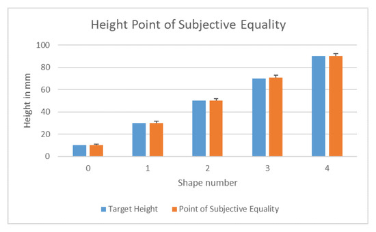 For the height adjustment task, the width of the cylinder is set to 30 mm. Table 1 depicts the mean continuous height adjustment for the five different target heights. Figure 7 depicts a graph of the mean values are compared to the target heights. There appears to be a linear fitting close to the optimal values. Descriptive statistics are shown in Table 2 for grow and shrink interactions of the five height point of subjective equality tasks. The results show a range of points of subject equality within an approximate range of −0.27 mm to 0.61 mm of the target sizes.