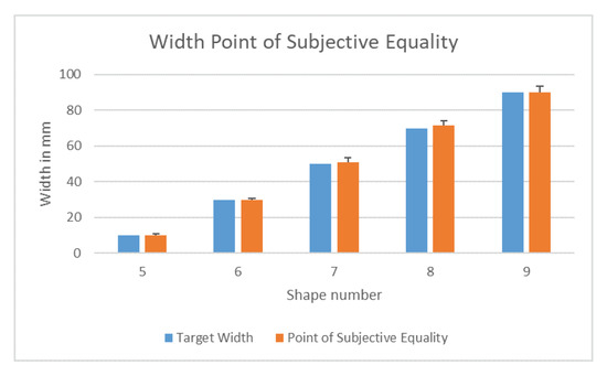 For the width adjustment task, the height of the cylinder is set to 50 mm. An overview of the results of the five different target widths of the width judgement for points of subject equality is shown in Table 3. The range of results for the points of subject equality is within a range of ~−1.38 mm to ~0.36 mm. Figure 8 depicts a graph of the mean values. There appears to be a linear fitting close the optimal values, but not as close as the height adjustment. A more in-depth view of the results of the width judgement for points of subject equality is provided with descriptive statistics in Table 4.