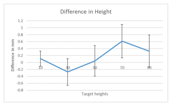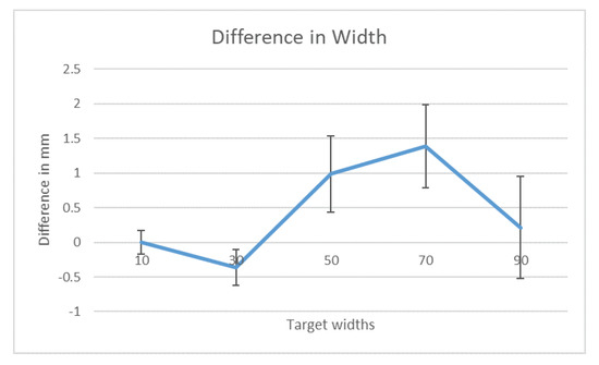 As previously defined, just-noticeable difference is a psychophysics measure to determine the amount a stimulus must be changed in order for a difference to be noticeable. Using a z score of 0.75 probability that is equal to 0.674, the JND is calculated by the following manner, , where SD is the standard deviation [12]. The Table 5 and Table 6 depict the values for the adjustments of both height and width for the ten target values. For the continuous height adjustment, they ranged from 0.6462 mm to 1.4500 mm. The width continuous adjustment has a range of 0.5234 mm to 2.2207 mm. These results are similar to what Zhou et al. [33] found for Fish Tank Virtual Reality displays. They found a size error of 2.3 mm for participants employing spherical FTVR.