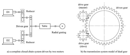 The master-slave control technology with dual servo motor can solve the above problems well. The dual servo motors D1 and D2 drive their independent transmission chains, respectively (as shown in Figure 1), and engage with the large tooth ring of the work platform to form a complete closed-loop chain system. At the same time, the closed-loop feedback is carried out by the circular grating installed at the center of the main axis of the workbench, which can effectively improve the tracking characteristics and positioning accuracy of the C-axis system.