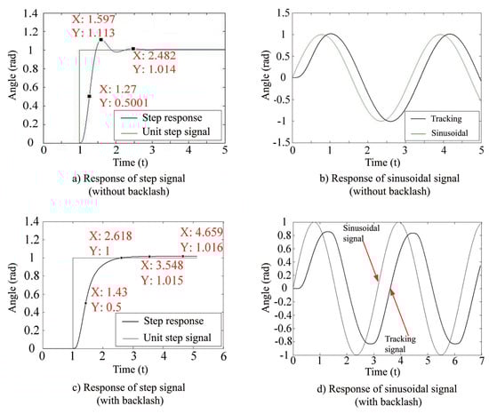 Figure 4 shows the response curve of the system under the input of unit step signal and sinusoidal signal when the PID parameter of the system is not adjusted. The output response of the normal unit step signal (Figure 4a) is compared with that of the unit step signal obtained under the condition of backlash (Figure 4c). It is found that the introduction of the non-linear link of the gear gap reduces the overruns of the dual motor master-slave control system, but also increases the response time of the system. In addition, the increase of the backlash parameter will lead to the instability of the control system and cause continuous oscillation. Under the condition that the integral time constant remains unchanged, the oscillation frequency of the step response of the system increases with the increase of the proportionality coefficient K, and the oscillation amplitude increases gradually. If the proportionality coefficient K is too small, then the oscillation frequency of the system is very low, but the adjustment time is too long, which cannot meet the actual demand of the high followability of the C-axis control system. While the proportion coefficient K is set too large, the system has a short adjustment time, but the overshoot and oscillation amplitude are large, the oscillation frequency is high, and the control is unstable. By comparing the response results of the sinusoidal signals in Figure 4b,d, it can be seen that the presence of the non-linear link of the backlash prolongs the response time of the system, reduces the amplitude, and reduces the followability of the C-axis control.