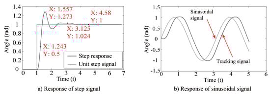 After PID parameter tuning, the response of the system to unit step signal and unit sinusoidal signal is shown in Figure 5a,b. It can be seen that, after parameter setting, the dual motor drive control system can get better time domain control index. As can be seen from Figure 5a, after tuning PID parameters, the signal’s rising time = 1.557 s, delay time = 1.243 s, adjustment time = 3.1 s, overshooting quantity p = 17%, and the number of oscillations N = 2.