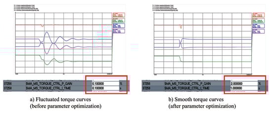 The purple curve is the torque curve of the driving axis and the green curve is the torque curve of the driven axis, as can be seen from Figure 6a. The fluctuation of the curve is the vibration frequency of the C-axis. In order to improve the accuracy of the C-axis and eliminate the gap between the gears, the curve needs to be adjusted until it is smooth, as shown in Figure 6b.