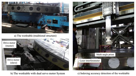 For super-heavy vertical milling lathe to have high milling and boring machining accuracy, the rotation Angle positioning error of the C axis of the worktable must be less than . The traditional gap elimination structure is to install an axially movable wheel group on a shaft of the transmission chain and realize the gap elimination through displacement. This experiment compares the effect of double-servo motor driven clearance worktable (as shown in Figure 7b) with that of traditional clearance worktable of the same specification (as shown in Figure 7a).