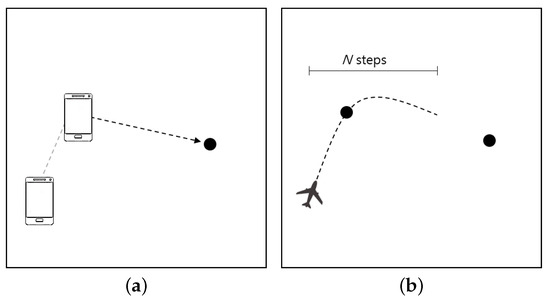 In order to avoid overlapped searches, we apply the trajectory-prediction scheme. Figure 2b is an example of predicting the trajectory for N time steps. The black points present destinations and the dotted line means predicted trajectory. As shown in Figure 2b, a UAV manages two destinations, the current and the next ones, because the predicting trajectory for N time steps can be passed over the current destination.