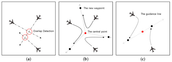 Examples of overlap avoidance: (a) Overlap detection; (b) generating guidance lines among three UAVs; and (c) generating a guidance line between two UAVs.