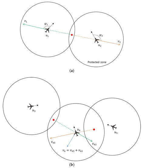 We redesign the Enhanced Gauss–Markov (EGM) model for avoiding overlap by applying the guidance vector scheme as shown in Figure 4. As same in Section 3.4.1, the overlap avoidance scheme is initiated when the protected zones of UAVs are duplicated. The turn direction of each UAV is also determined as the direction to the guidance vector from the current direction.