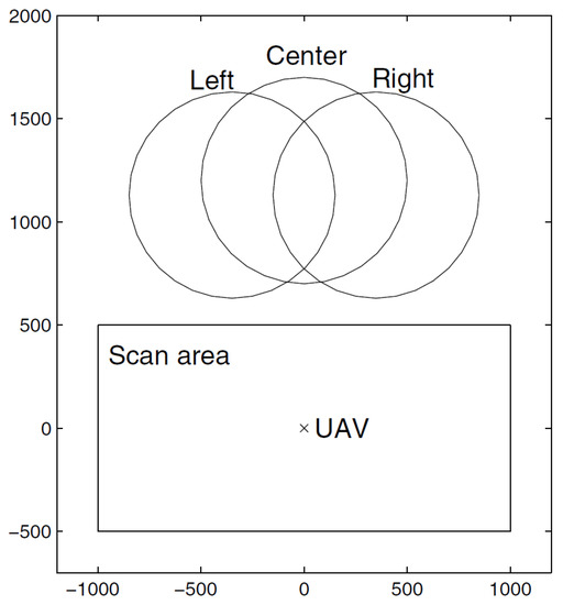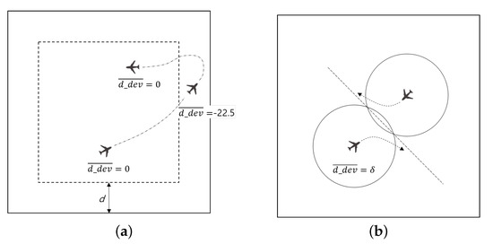 For the purpose of avoiding overlaps, we use the boundary avoidance scheme of Enhanced Gauss–Markov model. When the UAV decides to turn left (or right) after detecting overlap of protected zones, the mean direction deviation is set to for continuous left turn (or for right turn). Let us note that we use 2.5 for as shown in Figure 5b. Then, UAVs try to turn to different directions so as to avoid overlapped reconnaissance. After no protected zone is duplicated, the mean direction deviation is set to 0, as usual.