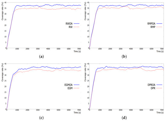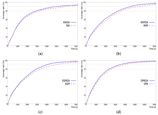 Coverage rate results with/without Overlap Avoidance: (a) Random Waypoint; (b) Random Markov Process; (c) Enhanced Gauss–Markov; and (d) Distributed Pheromone Repel.