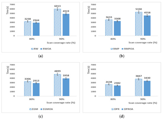 The coverage rate is defined by the ratio of scanned area in the whole area. Figure 7 shows simulation results of RW [23], RMP [12], EGM [16], and DPR [12] and those with overlap avoidance (OA). While Figure 7 shows the cumulative coverage rate, Figure 8 shows the time to reach the coverage rates of 80% and 90% of the whole area in the simulated mobility models.