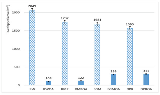 Among the proposed models, the RW with overlap avoidance model shows the smallest overlapped area because it turns the directions to other ways deterministically. On the contrary, the other three models adjust their action probabilities. In the DPR model with overlap avoidance, the pheromone information still affects to the action probabilities, which results in more overlapped area than other overlap-avoidance schemes.