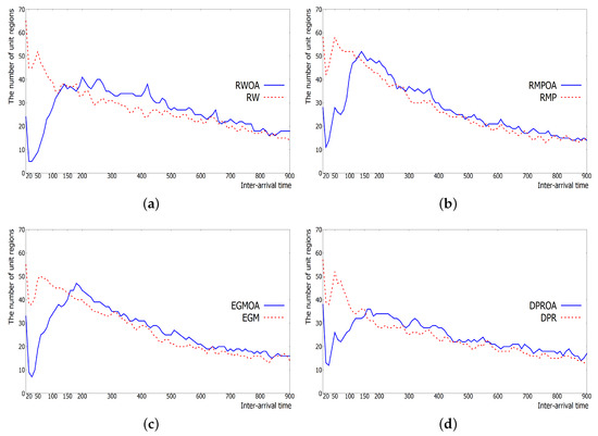 The number of unit regions per inter-arrival time with/without Overlap Avoidance: (a) Random Waypoint; (b) Random Markov Process; (c) Enhanced Gauss–Markov; and (d) Distributed Pheromone Repel.