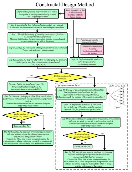 Geometrical optimization was done by using an association between constructal design and exhaustive search, as explained in recent literature [47]. Figure 2 illustrates the main steps employed for optimization of the problem. Steps 1 to 3 presents the flow system and identifies a performance indicator (here, it is filling time). Steps 4 and 5 show the constraints of the problem, degrees of freedom, and the main parameters of the physical problem. It is also necessary to understand the physical problem and define a method for its solution (numerical solution in this case).
