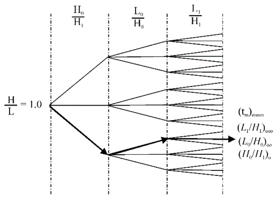Figure 3 illustrates that in the first optimization step, the ratio L1/H1 is varied, while the remaining parameters (L0/H0 and H0/H1) are kept fixed. To clarify how the terms are assigned, note that the minimum value found for the filling time is named the once minimized filling time (tm), and the corresponding ratio L1/H1 is called the once-optimized ratio of L1/H1, (L1/H1)o. In a second step, the same process is repeated by varying L1/H1 for the other ratios of L0/H0 and maintaining H0/H1 constant. At this stage of the process, two degrees of freedom are optimized (L1/H1 and L0/H0). In this case, the minimum filling time obtained is twice minimized (tmm), the L1/H1 ratio is the twice-optimized ratio (L1/H1)oo, and the L0/H0 ratio is once optimized (L0/H0)o. Finally, the second step is repeated for the different ratios of H0/H1 evaluated. Thus, the minimum filling time is the thrice-minimized (tmmm), and the optimal shapes are the thrice-optimized ratio of L1/H1, (L1/H1)ooo, the twice optimized ratio of L0/H0, (L0/H0)oo, and the once-optimized ratio of H0/H1, (H0/H1)o, completing the geometric optimization process.