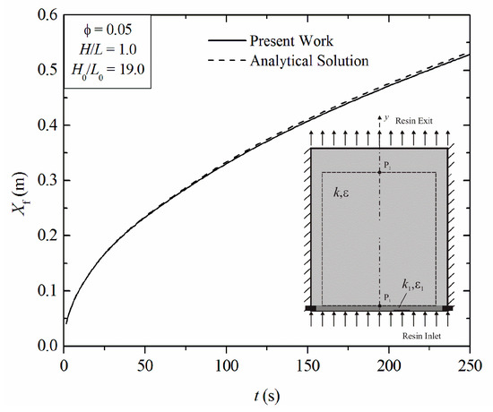 To show the reliability of the present computational model, a verification of the numerical method used here was done by comparing the present numerical solution and a classical analytical solution for the rectilinear case. More precisely, resin advancement as a function of infusion time obtained with the present method and the analytical solution described in Jinlian et al. [50] and Rudd [45] are compared. This comparison can be made for empty channels that lead to rectilinear behavior of resin in the porous medium. For the sake of comparison, a simulation in an I-shaped empty channel with ϕ = 0.05, H/L = 1.0, and L0/H0 = 19.0, where L0 is equal to L, is chosen. The case with these configurations represents a rectilinear case.