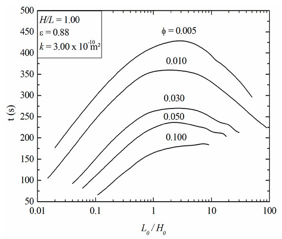 To evaluate the geometric influence of the I-shaped empty channel over the filling infusion time of the resin along the rectangular porous plate, the fraction area inside the domain is analyzed. Simulations performed with different L0/H0 ratios are used to determine the case with lower infusion time for five different fraction areas of the empty channel, ϕ = 0.005; 0.01; 0.03; 0.05 and 0.1. It has been found that the effect of the ratio L0/H0 over filling time (t) is similar for all investigated fractions ϕ. The only exception happened for ϕ = 0.1 due to the restriction of the geometry in the upper limit of L0/H0, as can be seen in Figure 5. In general, it is noticed that the lowest L0/H0 ratios lead to the best results, i.e., there is a reduction in filling time (t) when the channel has higher penetration in the y-direction of the domain. However, the progressive increase of L0/H0 to the upper limit results in a decrease in injection time too. Thus, there is a globally optimized ratio placed in the lowest region of L0/H0 and a local optimized ratio region, placed in the superior limit of the ratio L0/H0 investigated. The worst performance, for almost all cases of ϕ, is reached for intermediate ratios of L0/H0. Different behavior is noticed only for ϕ = 0.100, where there is an almost asymptotic growth of filling time as a function of ratio L0/H0, showing that restriction influences the best shape and effect of geometry over the performance indicator.