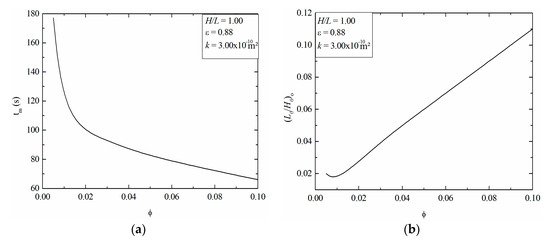 Effect of empty I-shaped channel area fraction (ϕ) over: (a) once minimized filling time (tm), (b) once optimized L0/H0 ratio, (L0/H0)o.