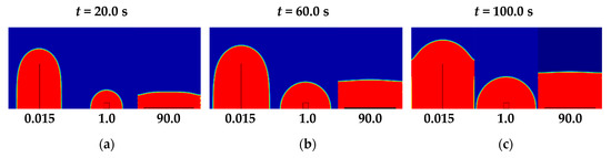 Figure 7 shows resin advancement for ϕ = 0.010 and three different magnitudes of the ratio L0/H0: (L0/H0)o = 0.015, L0/H0 = 1.0 and L0/H0 = 90.0, which represents the two extreme magnitudes and an intermediate value of the ratio L0/H0, where the worst performance was reached. Three different instants of time are illustrated to show resin impregnation along time t = 20.0 s (Figure 7a); 60.0 s (Figure 7b) and 100.0 s (Figure 7c). Figure 8 shows the resin flows for ϕ = 0.100 and two different ratios of L0/H0: (L0/H0)o = 0.11 and L0/H0 = 7.0, representing the optimal geometry and worst case for three different instants of time: t = 20.0 s (Figure 8a), 40.0 s (Figure 8b), and 60.0 s (Figure 8c).