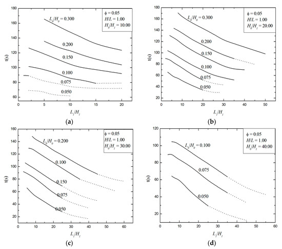 Subsequent investigation consisted of the evaluation of the influence of the T-shaped channel aspect ratios L1/H1, L0/H0, and H0/H1 on the filling time for resin impregnation in the rectangular porous plate. For this configuration, the optimization process was performed only for ϕ = 0.05 due to the high number of simulations needed. Firstly, the effect of the ratio L1/H1 on resin infusion time along the mold was evaluated for different values of the ratio L0/H0, keeping H0/H1 fixed. Figure 9a–d present the effect of the ratio L1/H1 over the filling time for various constant ratios of L0/H0 and four different magnitudes of H0/H1 = 10.0, 20.0, 30.0 and 40.0, respectively. It should be noted that for H0/H1 = 30.0 and H0/H1 = 40.0, the L0/H0 search space becomes more restricted due to the generation of very thin channels. For example, when H0/H1 = 40.0, the variation is viable only in the range 0.05 ≤ L0/H0 ≤ 0.1 because for higher magnitudes of L1/H1, the thickness of the bifurcated channel would become insignificant, which disfigures the T-shaped geometry of the channel and leads to the generation of permanent voids.