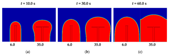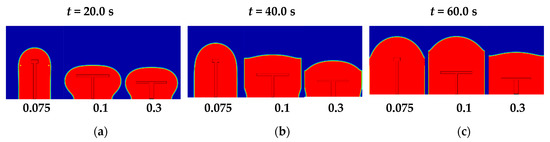 Figure 13 shows resin progression at the analyzed instants of time for H0/H1 = 10.0 and L0/H0 = 0.075, (L0/H0)o = 0.1, and L0/H0 = 0.3 corresponds to the lowest ratio of L0/H0, the optimal configuration, and the superior magnitude, respectively. For the lowest ratio of L0/H0, it is observed that the T-shaped channel almost degenerates into an I-shaped channel. This configuration leads to a poor distribution of resin in the lower region of the porous plate. The resin propagation is shown for three different instants of time: t = 20.0 s (Figure 13a), t = 40.0 s (Figure 13b) and t = 60.0 s (Figure 13c).