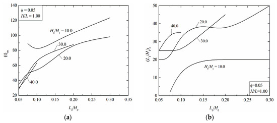 Effect of the ratio L0/H0 for different ratios of H0/H1 on (a) infusion time (once minimized), (t)m; (b) ratio (once optimized), (L1/H1)o.